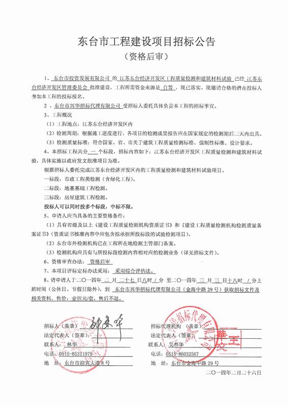 文章来源:东台市兴华招标代理有限公司 添加时间:2014/2/27 10:56:29 点击率:2729