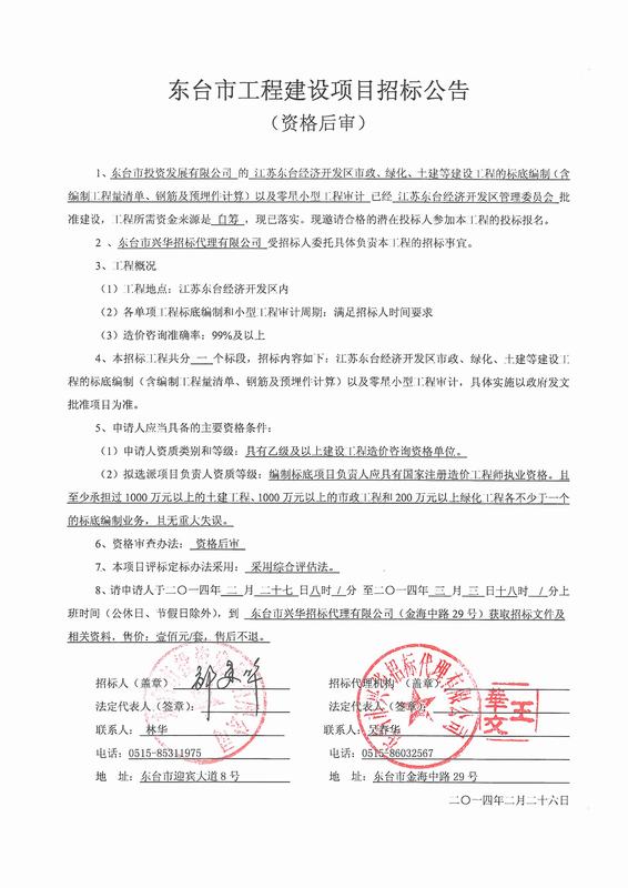 文章来源:东台市兴华招标代理有限公司 添加时间:2014/2/27 10:57:08 点击率:2573