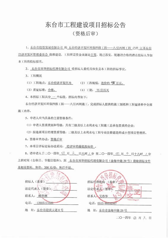 文章来源:东台市兴华招标代理有限公司 添加时间:2014/4/6 14:15:05 点击率:2594