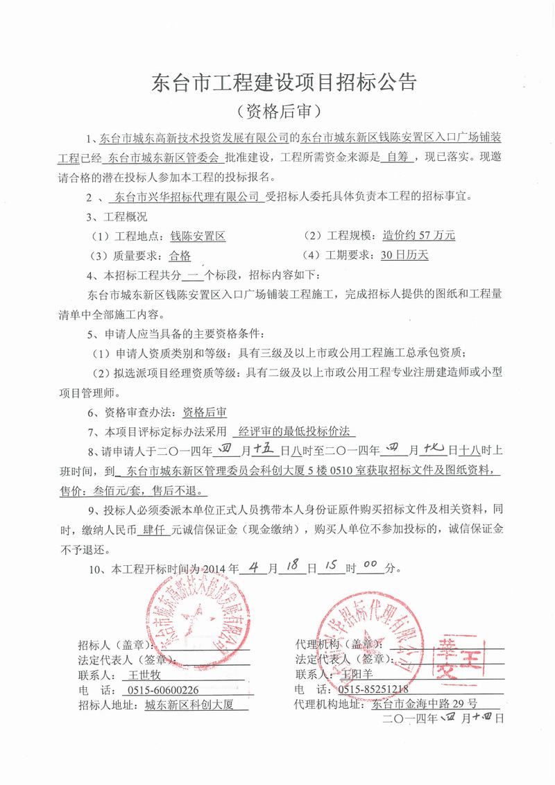 文章来源:东台市兴华招标代理有限公司 添加时间:2014/4/14 19:01:42 点击率:2775