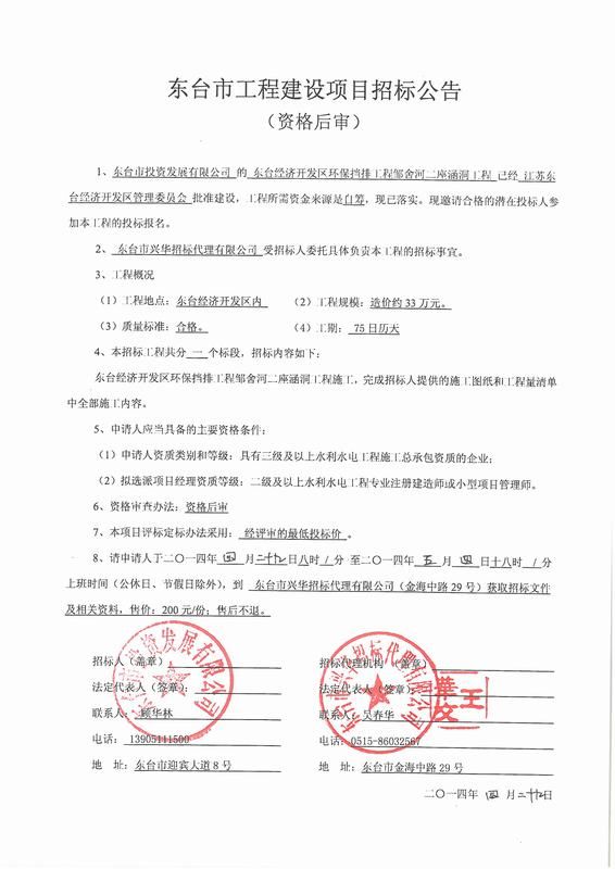 文章来源:东台市兴华招标代理有限公司 添加时间:2014/4/29 19:22:30 点击率:2666