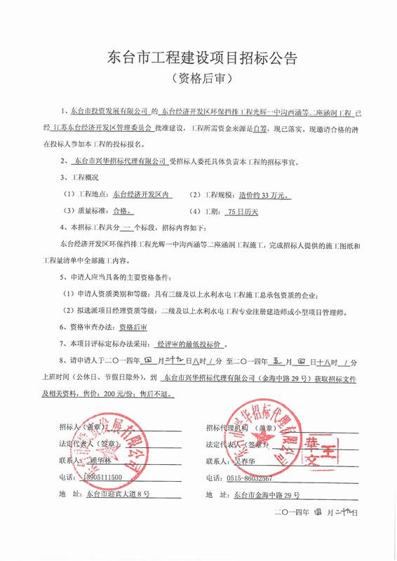 文章来源:东台市兴华招标代理有限公司 添加时间:2014/4/29 19:23:09 点击率:2972