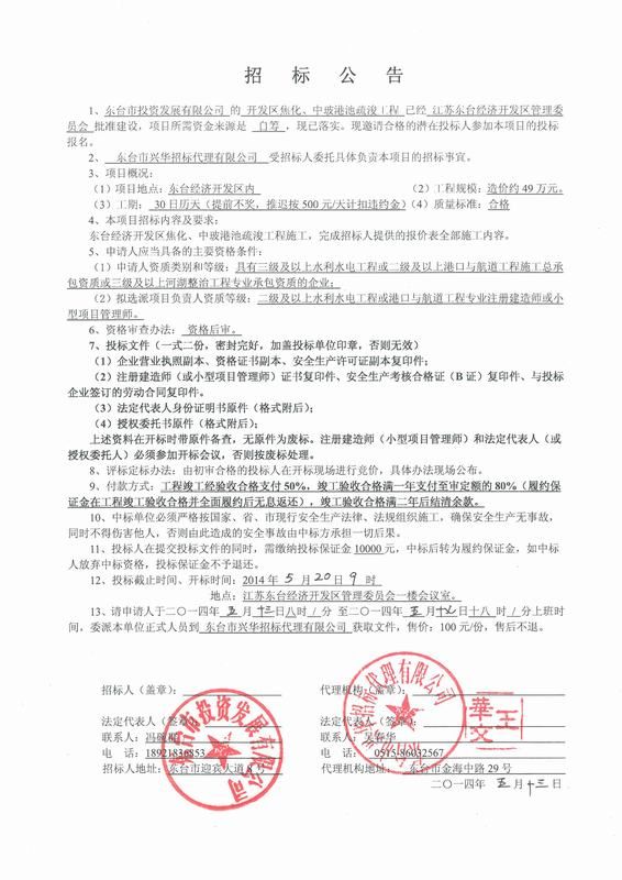 文章来源:东台市兴华招标代理有限公司 添加时间:2014/5/13 16:42:58 点击率:3085