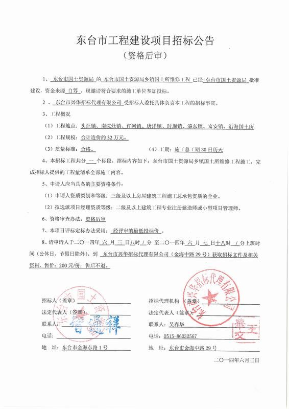 文章来源:东台市兴华招标代理有限公司 添加时间:2014/6/3 18:39:59 点击率:2873