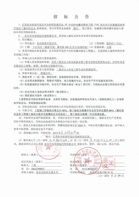 文章来源:东台市兴华招标代理有限公司 添加时间:2014/6/19 8:40:00 点击率:3322