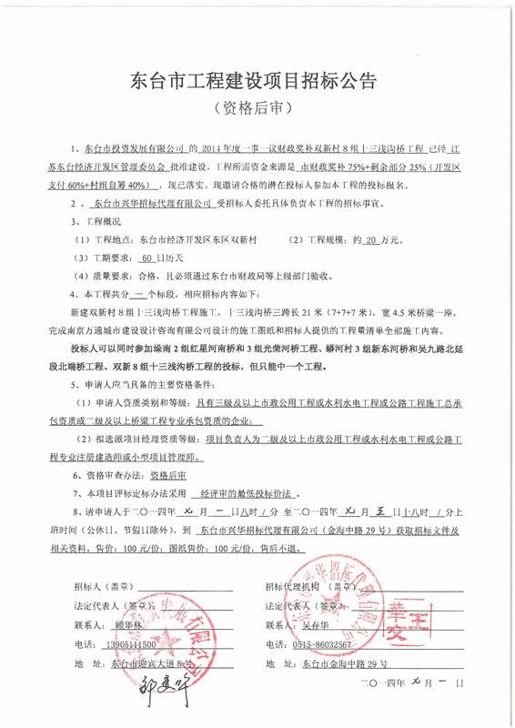 文章来源:东台市兴华招标代理有限公司 添加时间:2014/7/1 17:05:12 点击率:3405