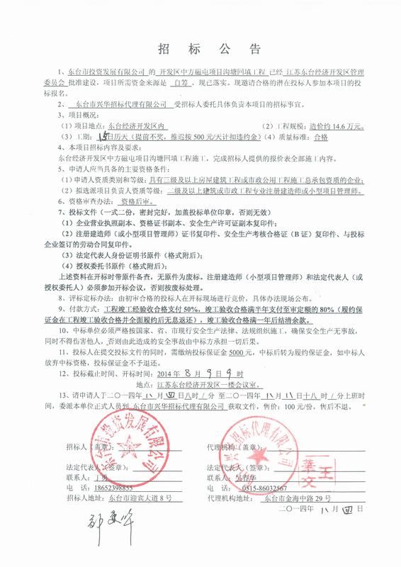 文章来源:东台市兴华招标代理有限公司 添加时间:2014/8/4 11:31:57 点击率:3676