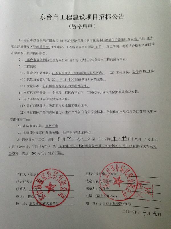 文章来源:东台市兴华招标代理有限公司 添加时间:2014/10/9 17:00:58 点击率:3497