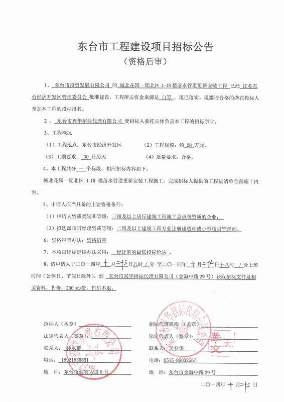 文章来源:东台市兴华招标代理有限公司 添加时间:2014/10/23 10:22:21 点击率:3518