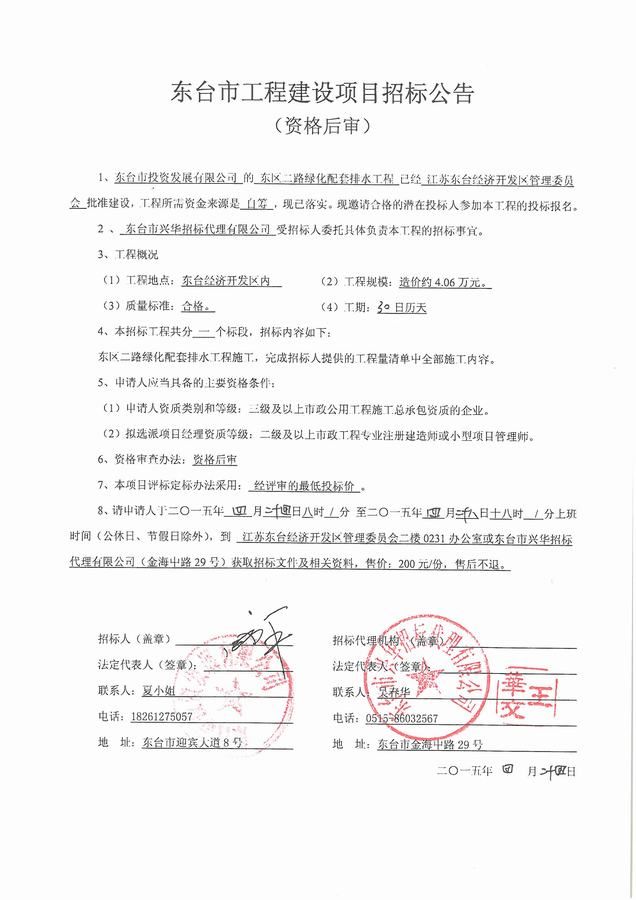文章来源:东台市兴华招标代理有限公司 添加时间:2015/4/24 14:20:50 点击率:2312