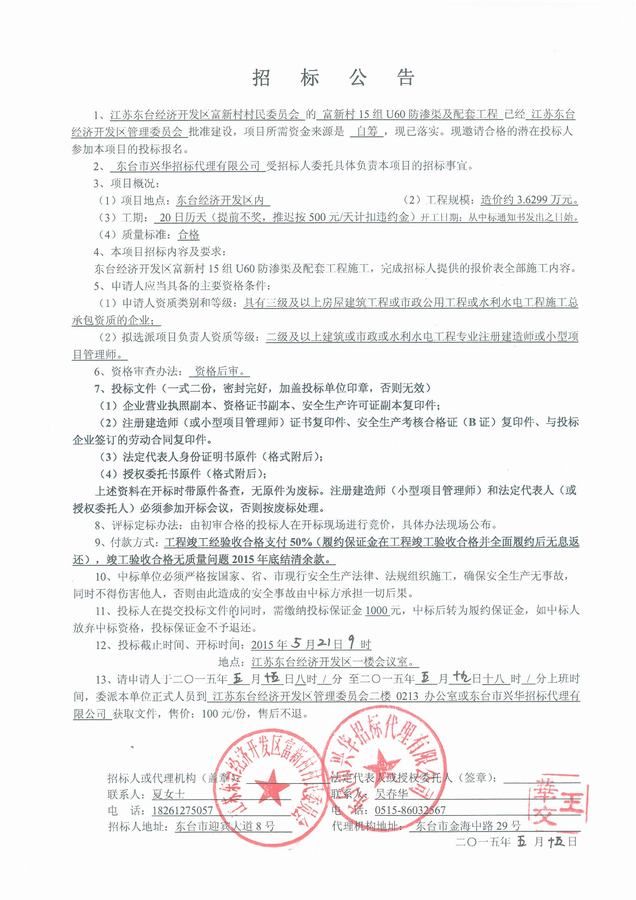 文章来源:东台市兴华招标代理有限公司 添加时间:2015/5/15 10:52:19 点击率:2711