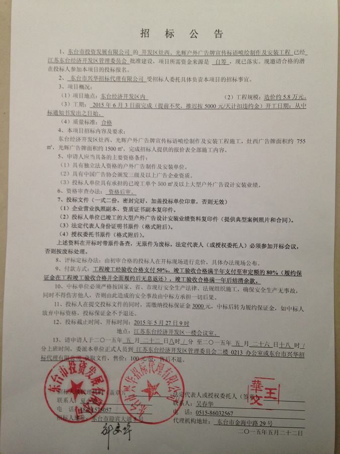 文章来源:东台市兴华招标代理有限公司 添加时间:2015/5/22 11:19:24 点击率:2669