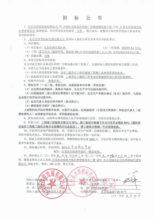 文章来源:东台市兴华招标代理有限公司 添加时间:2015/6/10 11:37:28 点击率:2645