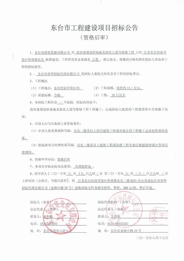 文章来源:东台市兴华招标代理有限公司 添加时间:2015/6/19 11:59:38 点击率:2728