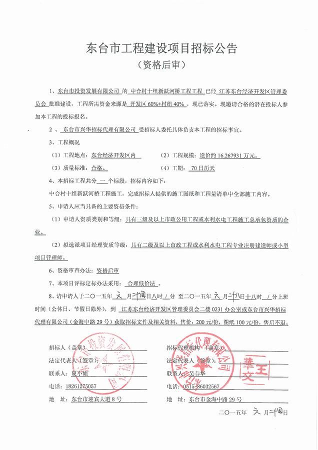 文章来源:东台市兴华招标代理有限公司 添加时间:2015/6/24 14:04:39 点击率:2477
