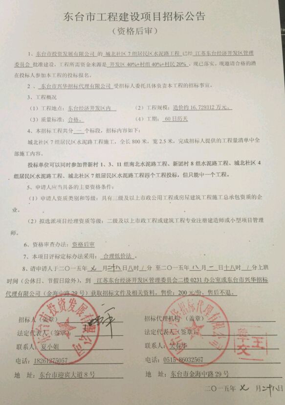 文章来源:东台市兴华招标代理有限公司 添加时间:2015/7/28 10:28:51 点击率:2467