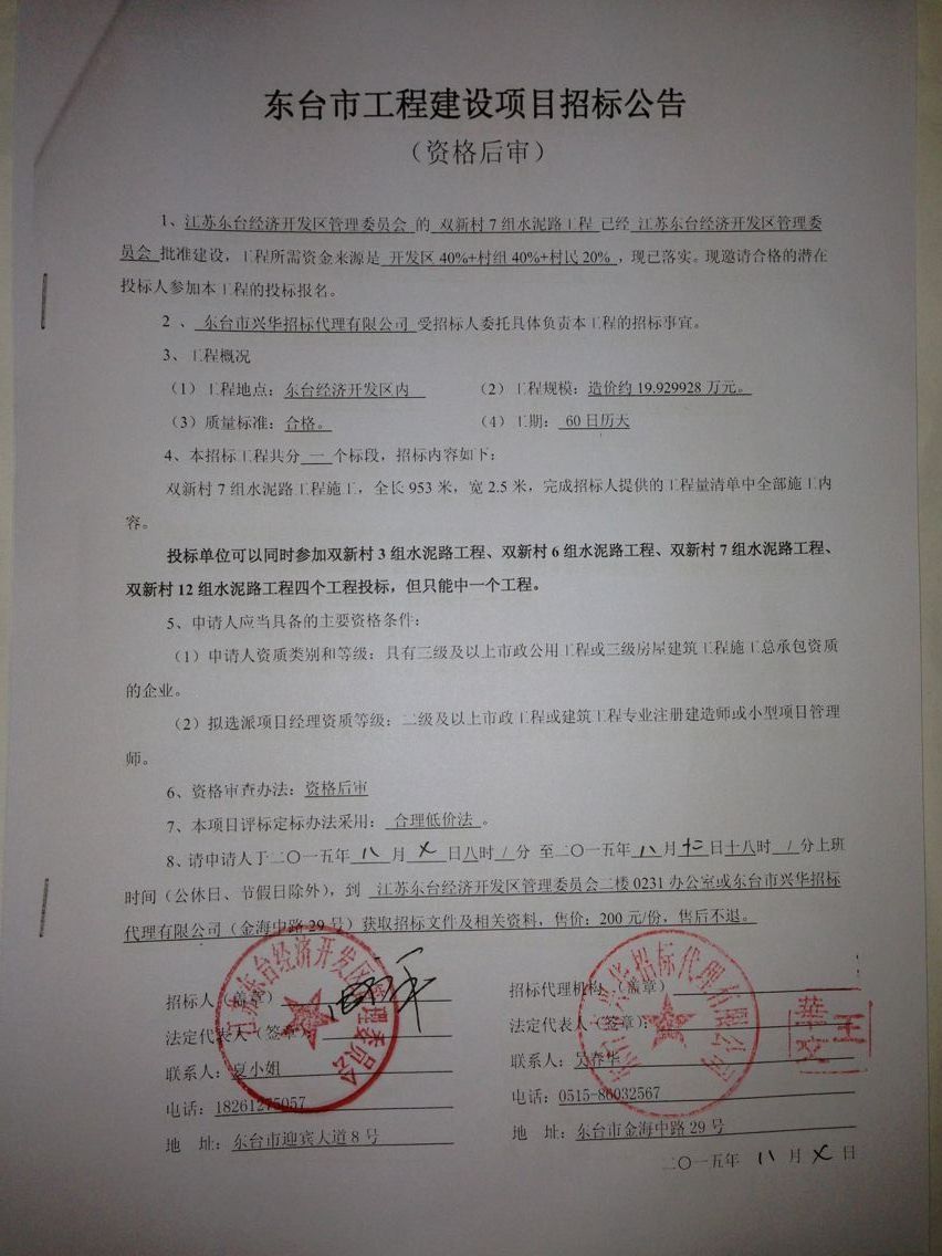 文章来源:东台市兴华招标代理有限公司 添加时间:2015/8/7 9:41:26 点击率:2722