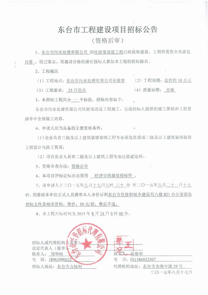 文章来源:东台市兴华招标代理有限公司 添加时间:2015/8/17 17:55:40 点击率:2672