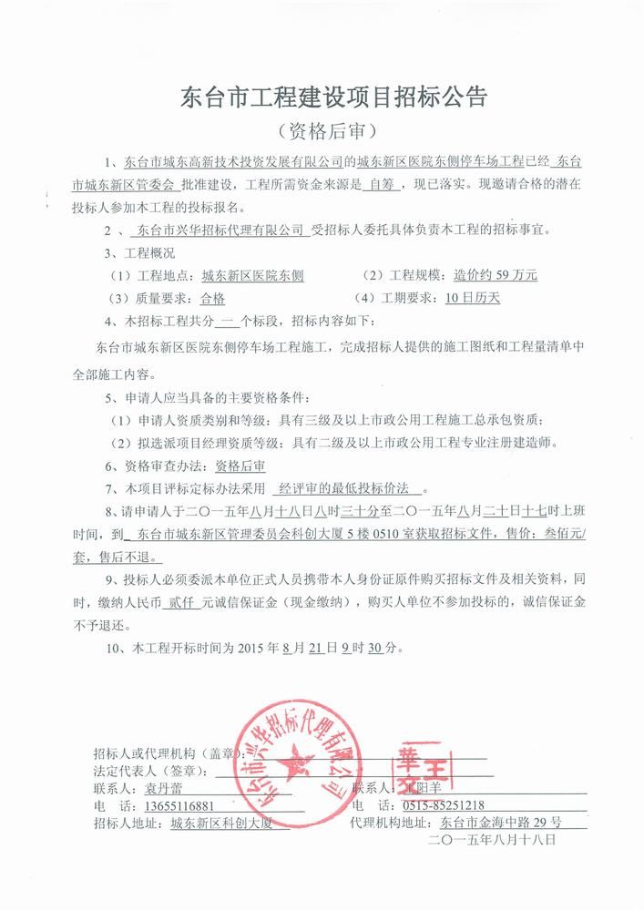 文章来源:东台市兴华招标代理有限公司 添加时间:2015/8/17 17:57:19 点击率:2707