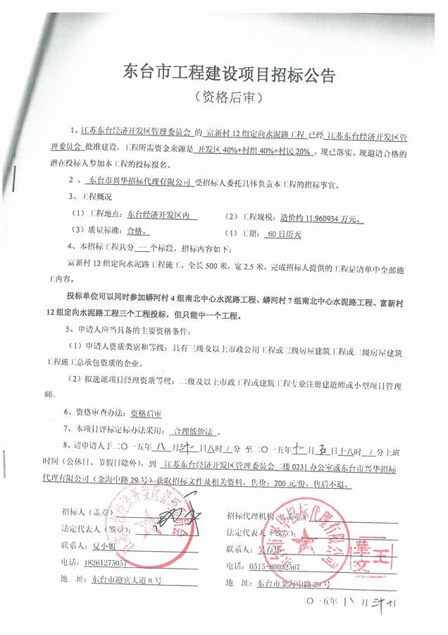 文章来源:东台市兴华招标代理有限公司 添加时间:2015/8/31 10:19:20 点击率:2506
