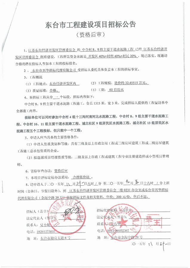 文章来源:东台市兴华招标代理有限公司 添加时间:2015/8/31 10:21:31 点击率:2623
