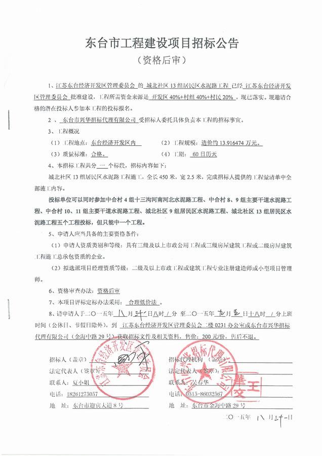文章来源:东台市兴华招标代理有限公司 添加时间:2015/8/31 10:23:01 点击率:2606