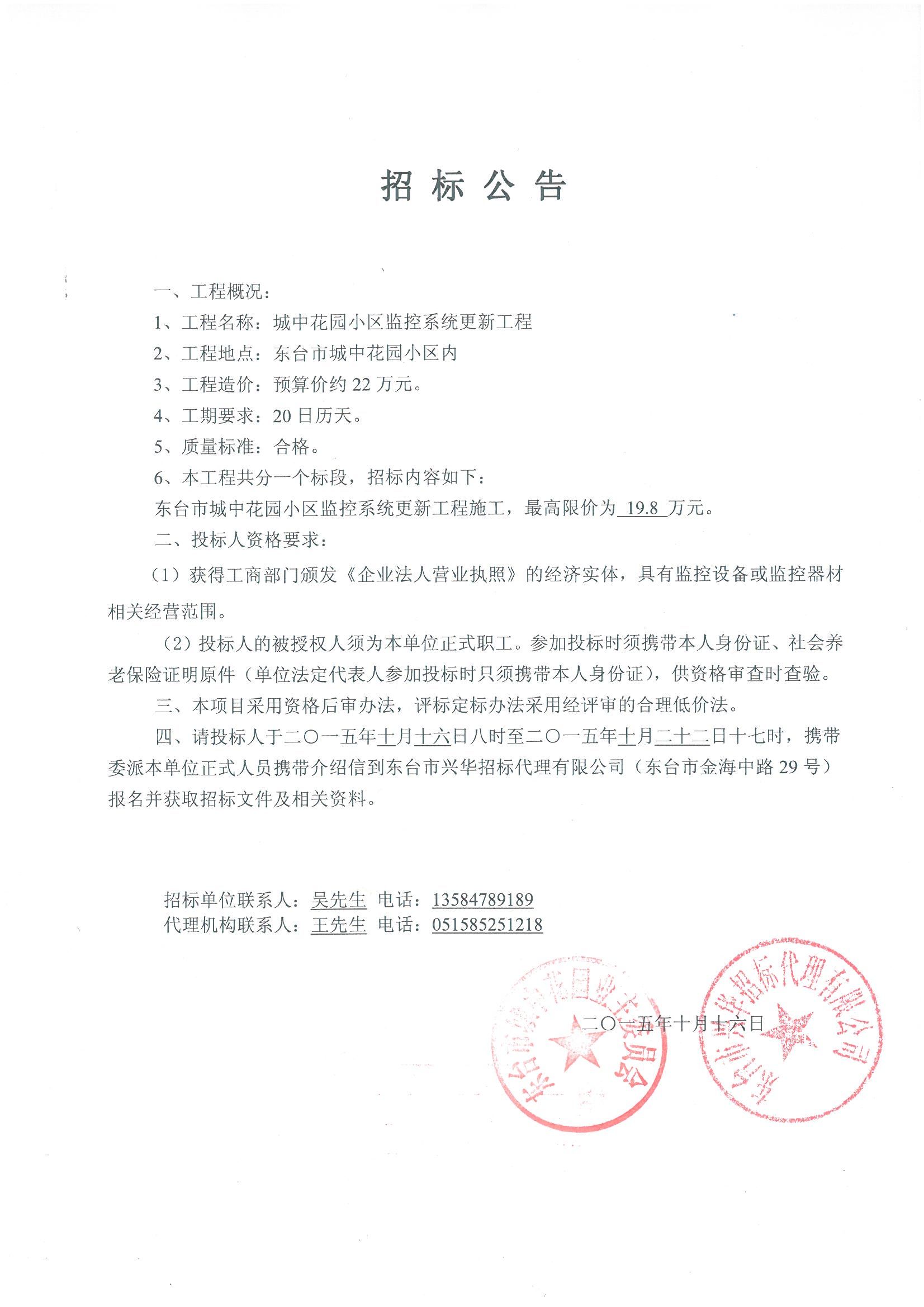文章来源:东台市兴华招标代理有限公司 添加时间:2015/10/16 8:30:47 点击率:2246