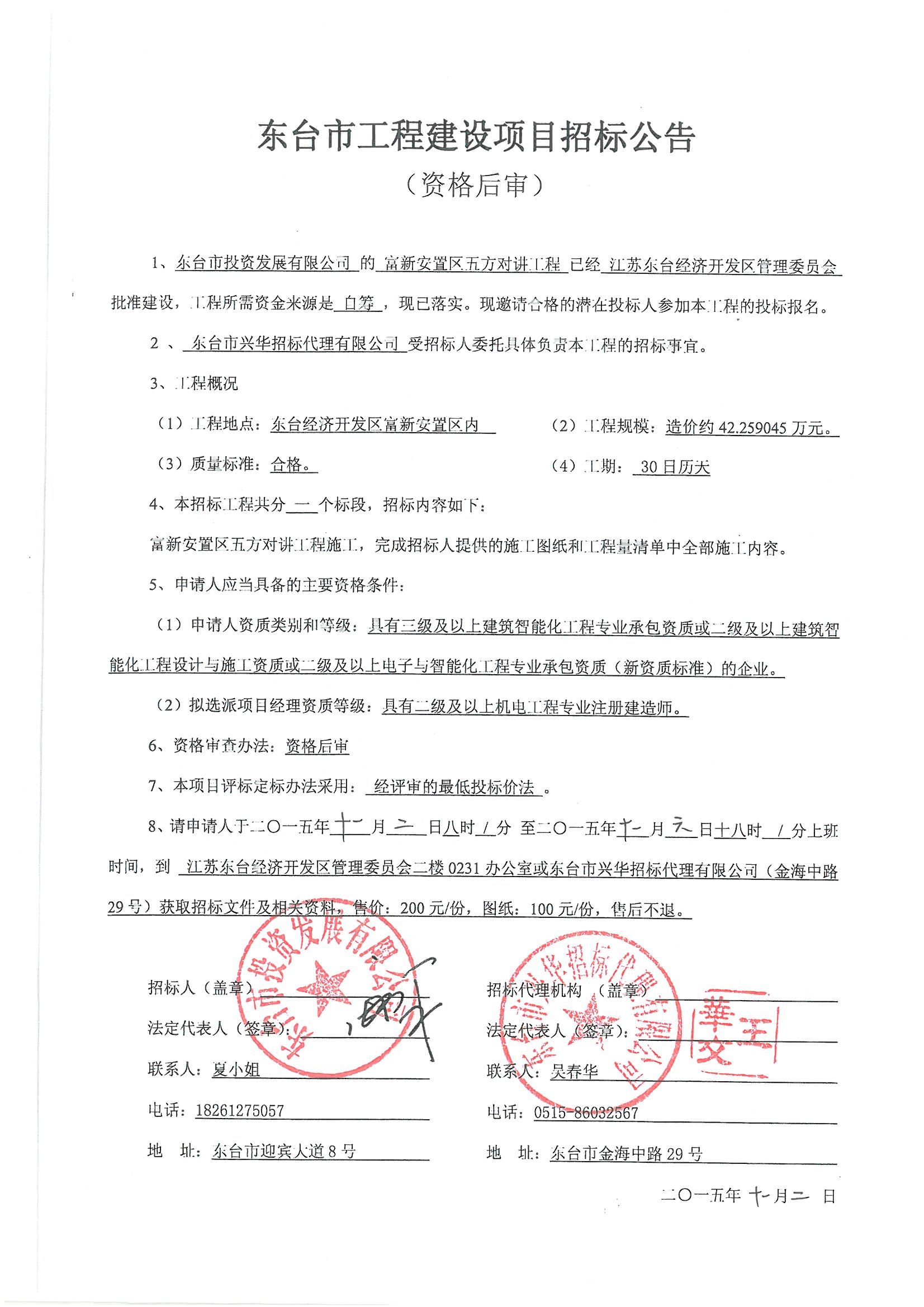 文章来源:东台市兴华招标代理有限公司 添加时间:2015/11/2 16:42:37 点击率:1977