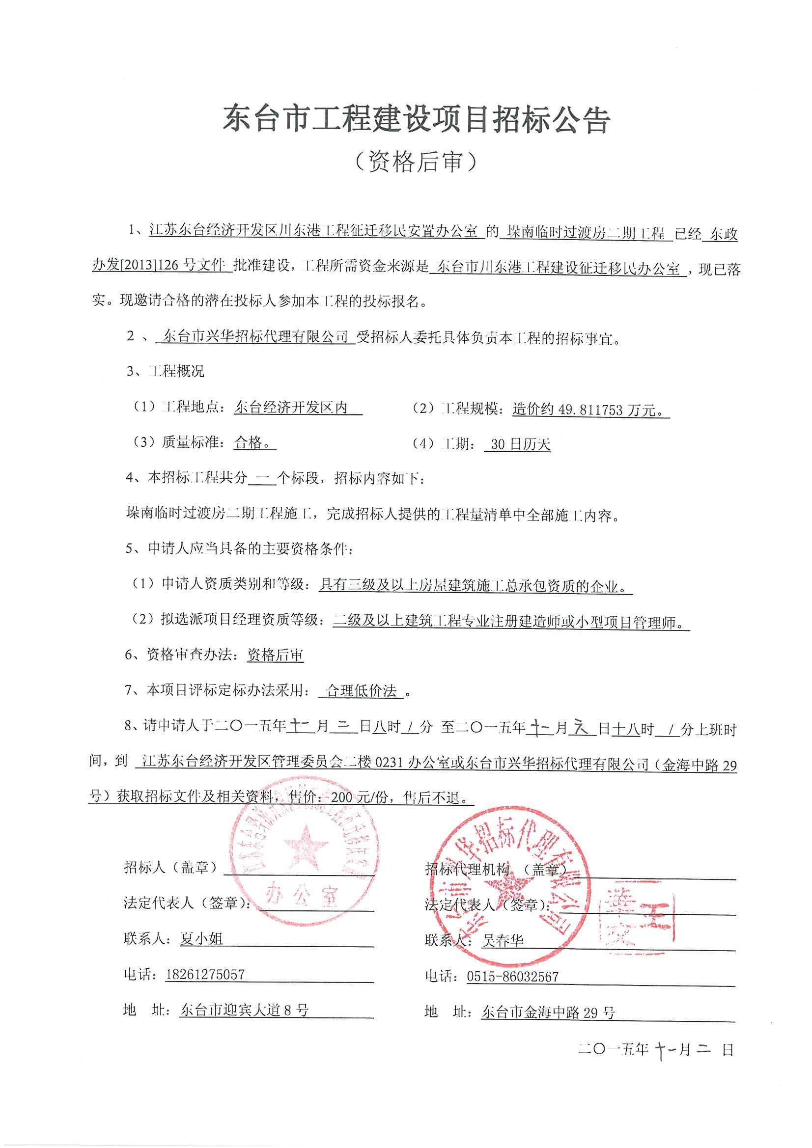 文章来源:东台市兴华招标代理有限公司 添加时间:2015/11/2 17:15:53 点击率:2159