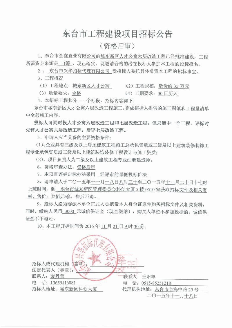 文章来源:东台市兴华招标代理有限公司 添加时间:2015/11/17 14:42:46 点击率:1891