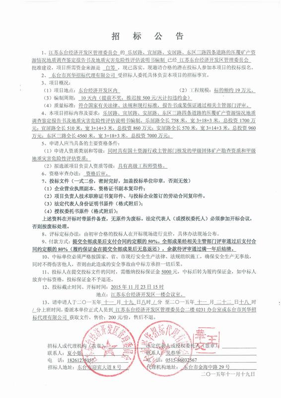 文章来源:东台市兴华招标代理有限公司 添加时间:2015/11/19 17:04:27 点击率:2044