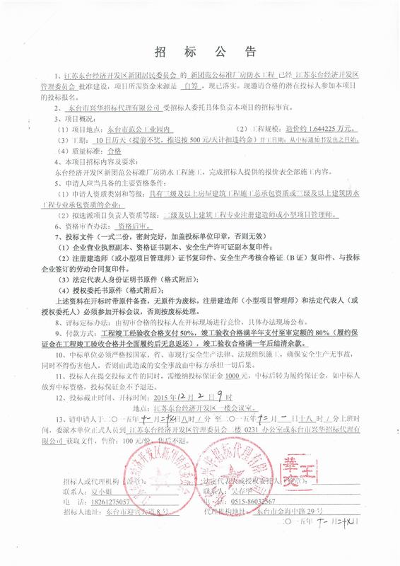 文章来源:东台市兴华招标代理有限公司 添加时间:2015/11/27 9:58:24 点击率:1917