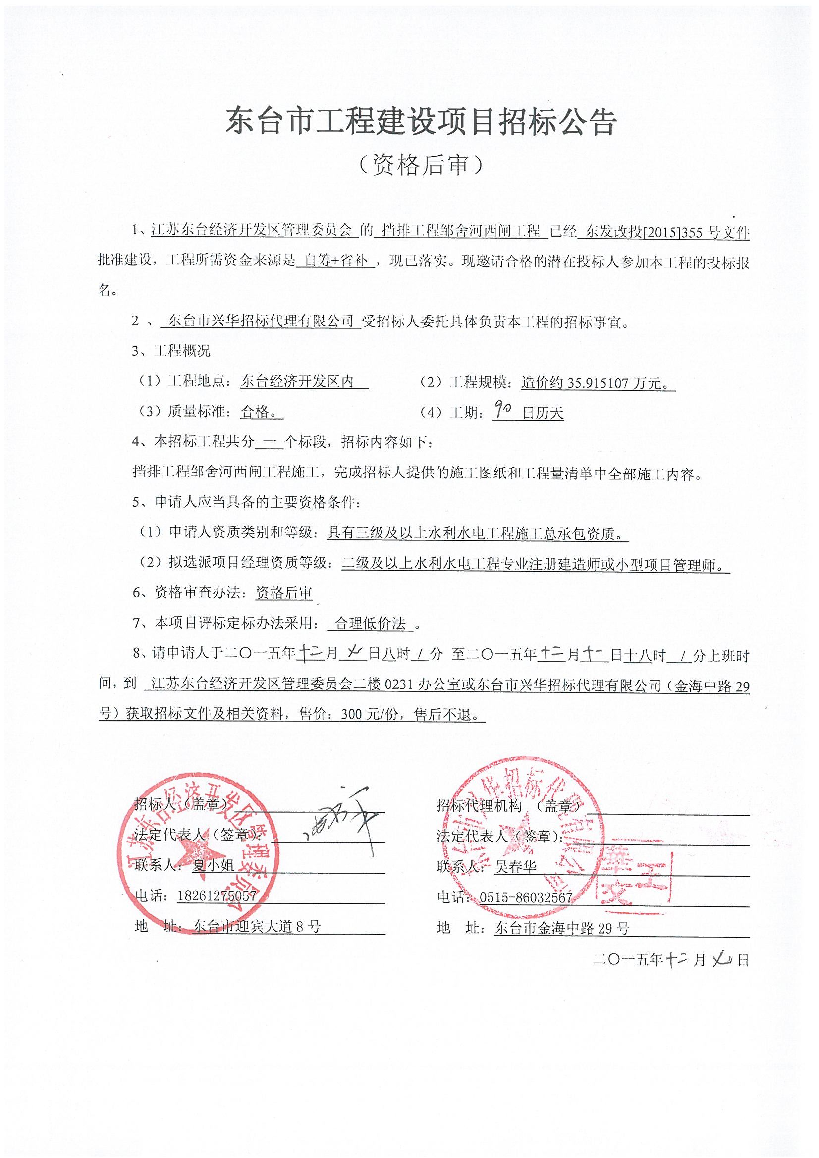 文章来源:东台市兴华招标代理有限公司 添加时间:2015/12/7 18:18:04 点击率:1978