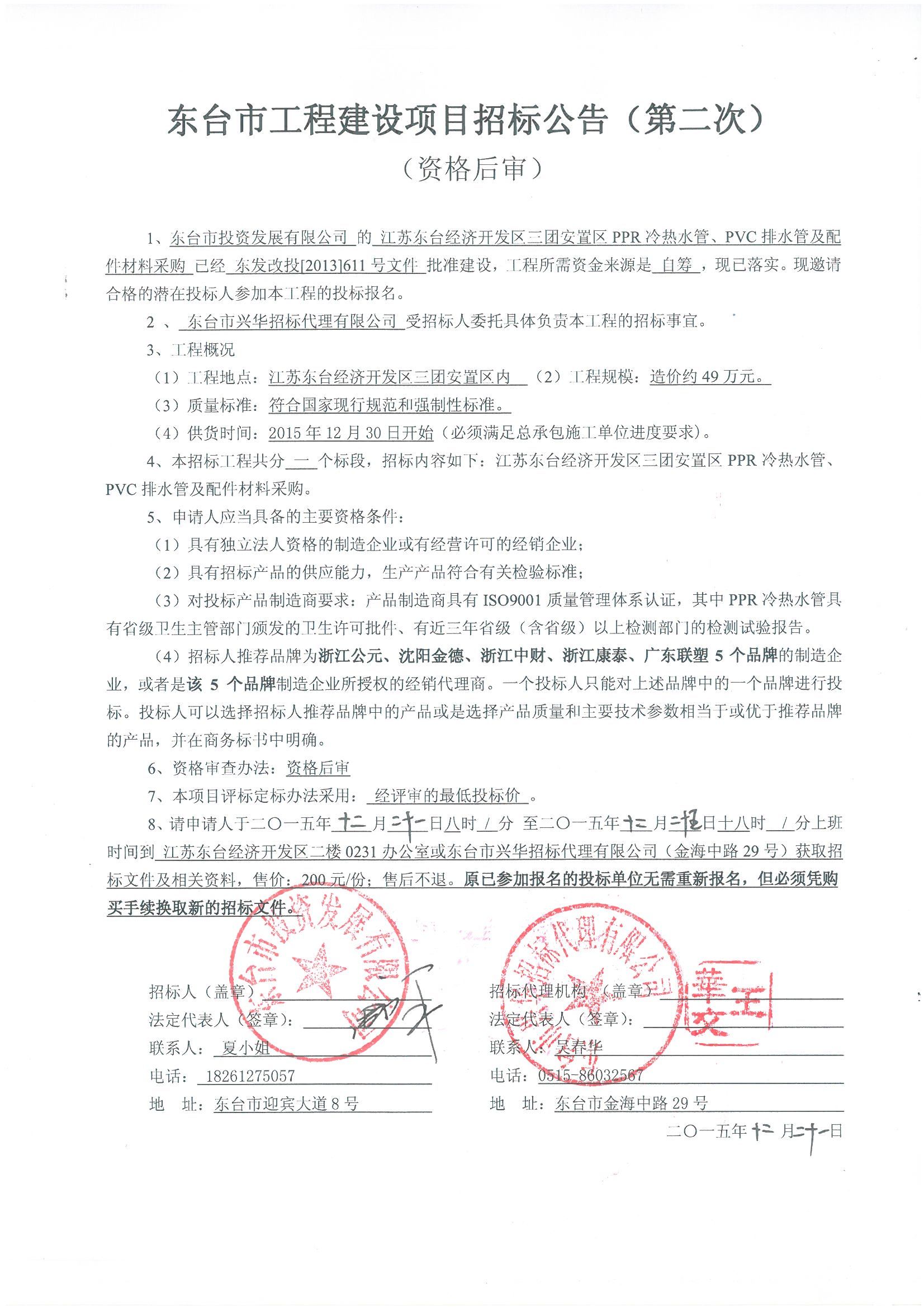 文章来源:东台市兴华招标代理有限公司 添加时间:2015/12/21 11:19:50 点击率:2011