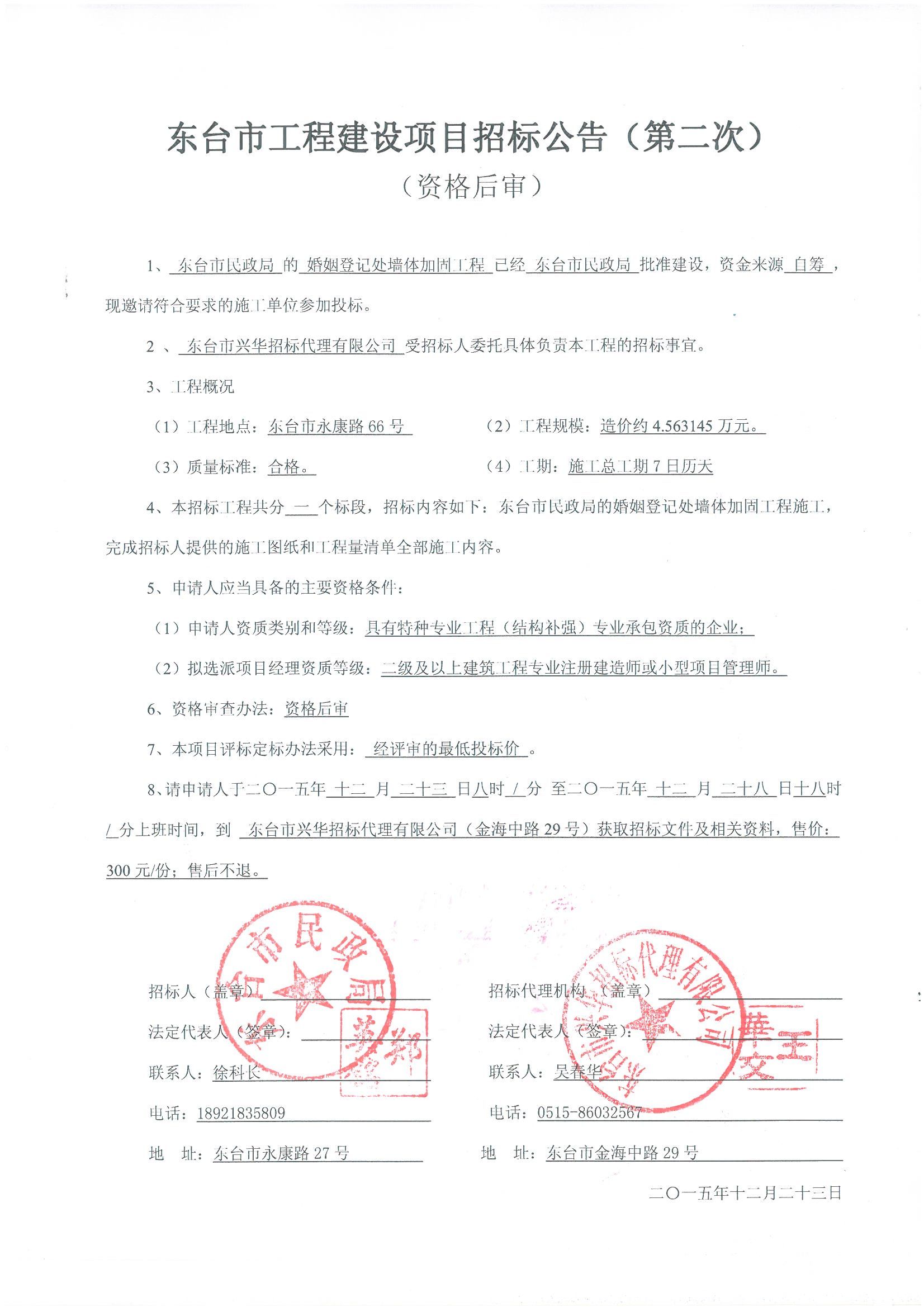 文章来源:东台市兴华招标代理有限公司 添加时间:2015/12/22 15:57:42 点击率:2061