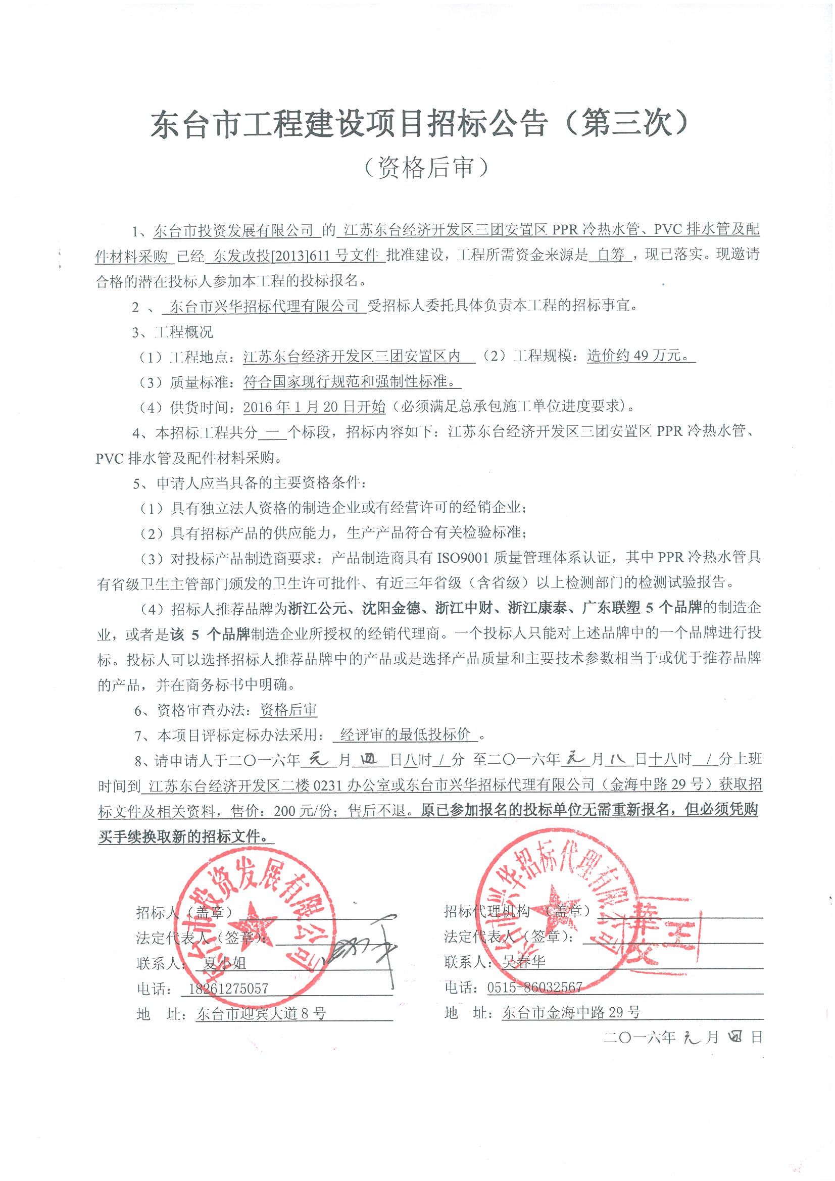 文章来源:东台市兴华招标代理有限公司 添加时间:2016/1/4 11:32:16 点击率:1795