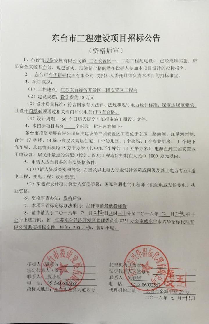 文章来源:东台市兴华招标代理有限公司 添加时间:2016/2/25 15:37:01 点击率:1975