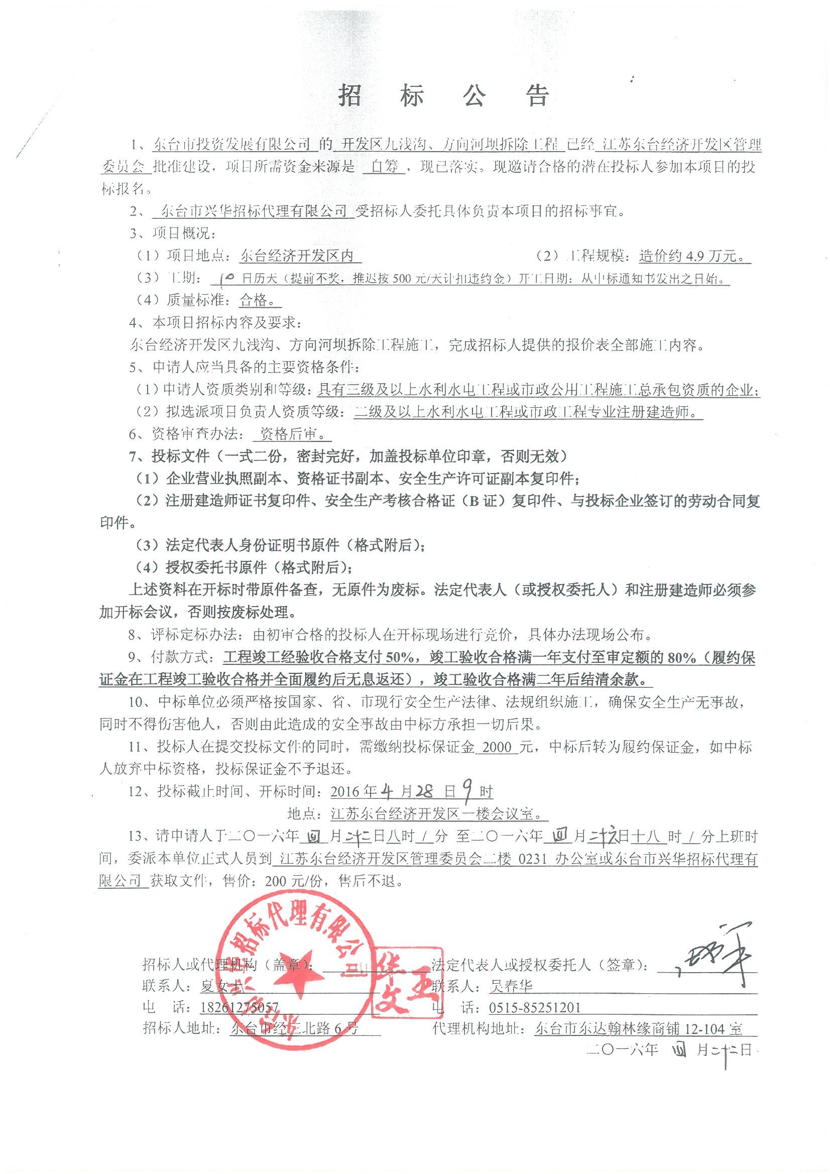 文章来源:东台市兴华招标代理有限公司 添加时间:2016/4/22 14:28:45 点击率:1984