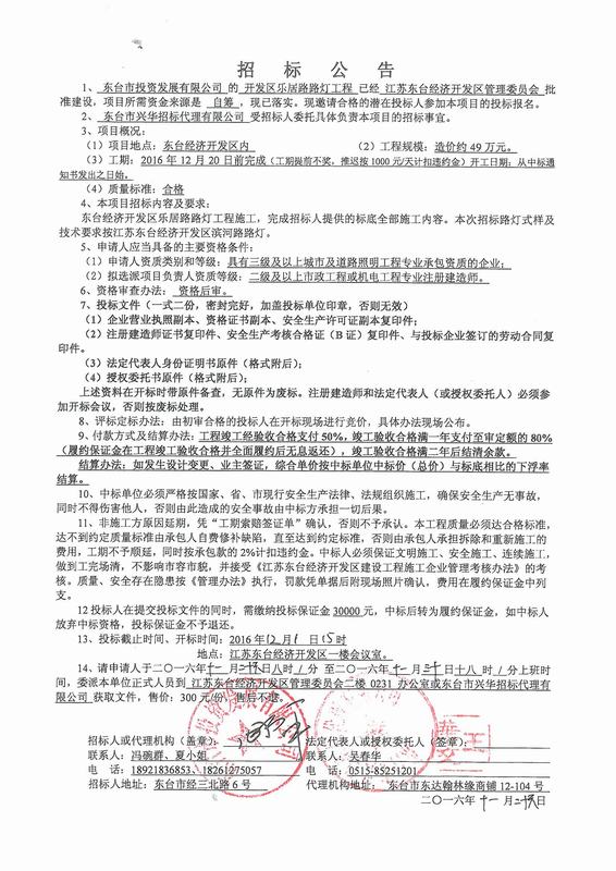 文章来源:东台市兴华招标代理有限公司 添加时间:2016/11/26 12:12:38 点击率:1812