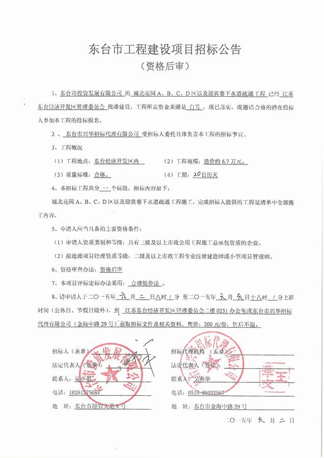 文章来源:东台市兴华招标代理有限公司 添加时间:2015/6/2 15:30:19 点击率:2680