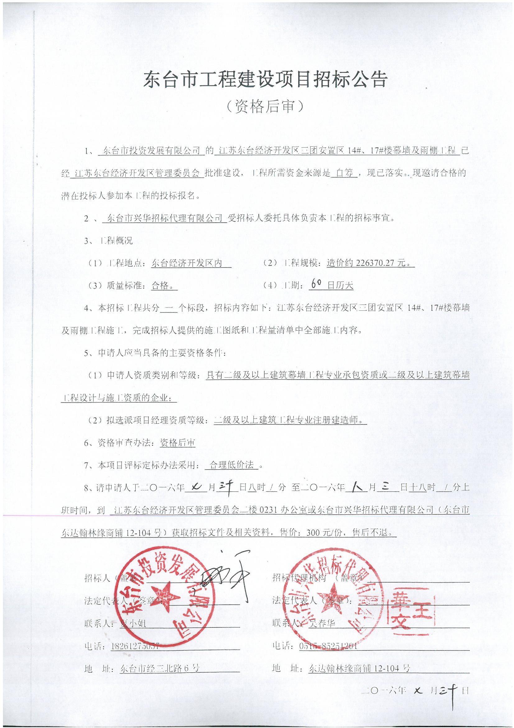 文章来源:东台市兴华招标代理有限公司 添加时间:2016/7/30 10:04:50 点击率:1871