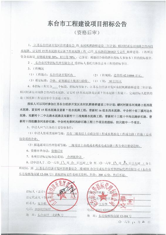 文章来源:东台市兴华招标代理有限公司 添加时间:2016/8/2 16:11:56 点击率:1858