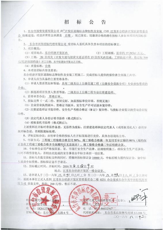 文章来源:东台市兴华招标代理有限公司 添加时间:2016/8/12 16:35:24 点击率:1925