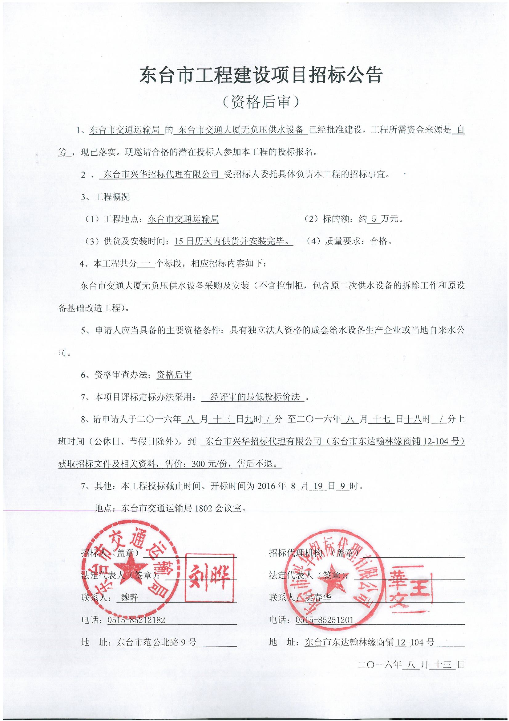 文章来源:东台市兴华招标代理有限公司 添加时间:2016/8/13 10:05:14 点击率:1821