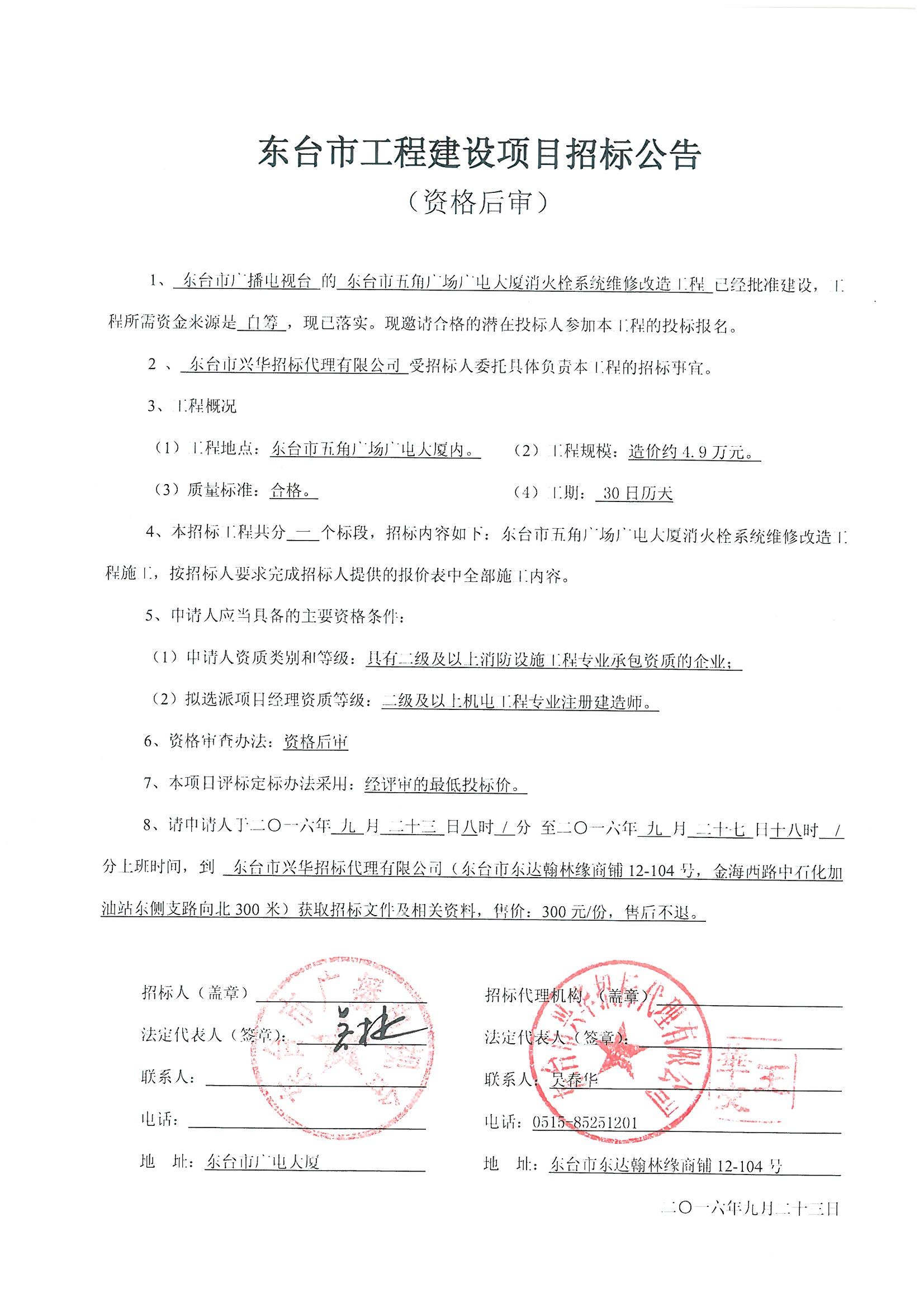 文章来源:东台市兴华招标代理有限公司 添加时间:2016/9/23 11:59:43 点击率:1746